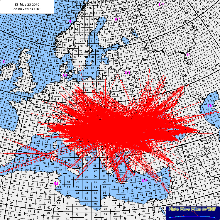 Rig: FT290RII + 60 Watt, 18 el Log: Date Time Call Grid Qrb 23 MAY 2010 13:42 UY5ON KN89CW 2239 23 MAY 2010 13:45 UA6MA KN97VE 2347 23 MAY 2010 13:46 YO8RHI KN37TE 1540 23 MAY 2010 13:47 YO8SCT KN37TD 1537 23 MAY 2010 13:48 YO6MF KN36KN 1453 23 MAY 2010 13:52 UR5VEB KN58FJ 1791 23 MAY 2010 14:03 EB3EPR JN01NB 1101 23 MAY 2010 14:14 EB3DYS JN11CK 1025 23 MAY 2010 16:04 UA3WM KO72QI 2326 23 MAY 2010 16:09 UR5UI KN59BS 1860 Comment: I and Joe IT9BLB were at the IR9Y Contest/Vhf site to test the BLB's new Elekraft K3, when ES popped up. No good equipment, only my back-up Vhf contest rig. NOTE: for both EB3 qso's, my ant was at 90°, no sigs with ant to 280°, so I believe both qso via ES. Also IT9BLB had qso with: UA6MA, UA3WM, UR5UI HRD: RA3WDK, EA2BDV, EA9IB (was new-one, sigh!), EB3DUS |