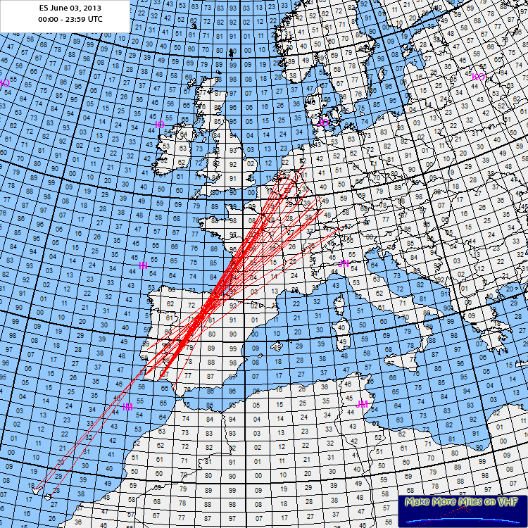 At 17:00 GMT the band opened with a reflectionpoint over the Gulf of Biskaje. Unfortunatly the opening lasted only for about 15 minutes. There was a chance to work EA8 as they were QRV and there was tropo/ES to CT as well. But no double hop or mixed tropo/ES was reported today.