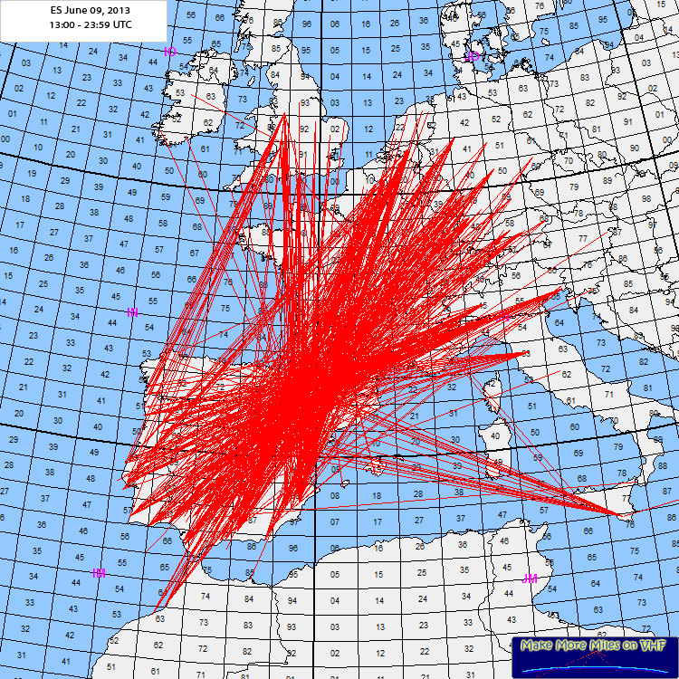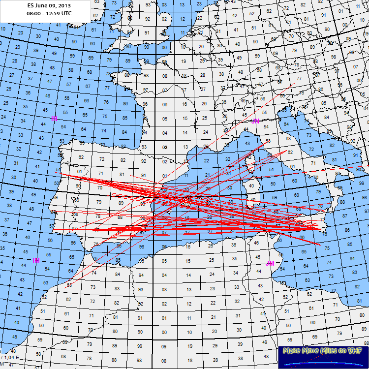 The first Es was reported in the morning around 09:00 GMT over the southern Mediterranean Sea. At first it looked like seatropo but the signals came well into the mainland. Around 12:15 GMT a second opening took place on the same place and a third small one was around 16:14 GMT between southern England and Sicily. After that the MUF rised over south-west France resulting in good ES as the reflectionzone was at a good spot and stayed there for a long time. It resulted in good Es and nearly 1600 QSO's are reported. CT1DIZ reports to have worked >250 stations, CT1ANO >100 and CS7/PDoHNL >90. It was good to see activity from CN8 and EA9. Big question is...where are the stations from Algeria (7T-7Y )but... at least 7X5QB from JM25 was QRV and worked some Es. |
