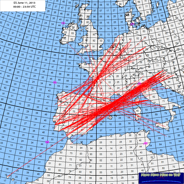 Sporadic E in southern France and northern Spain near the Pyrynees. A large area with high MUF provided an opening that lasted for about 1 hour...