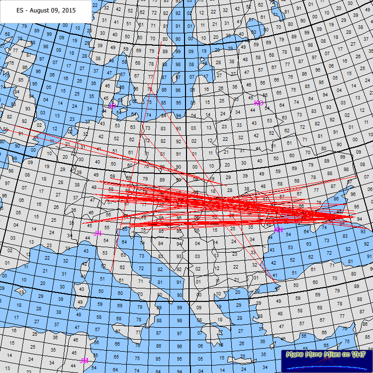 Rig: Icom IC7400, Beko PA 400W, 9 ele ODX: UW8SM 1931km Log: 10:17 UW8SM KN28IV 1931km 10:26 SP8WJW KN09SR 1684km Comment: Late season opening caught me by surprise as looking for Perseids MS. UW8SM big signal but others in IO81 to the south-west of me had smaller signals, once again the opening was very localised. With this and other 2m Es inc TA1D on 8th July, 2015 has been one of the very best 2m Es seasons for me, after 2014 which was so poor. 73 - Darrell G0HVQ |