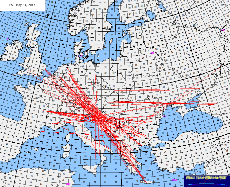 Rig: 4xRA60 ODX: IV3MPI 2135 km Log: 09:14 S57LM JN76hd 2050 km 09:16 S59GS JN75oo 2011 km 09:32 IV3MPI JN65sv 2135 km 10:32 SP2QBQ JO94fl 15:33 HA1FV JN77jj 15:34 YO8TK KN27tm 15:35 OK2PM JN99ao 15:36 HA0HO KN07su 15:36 HA6NM JN98pb 15:36 YO5OHY KN17sp 15:37 YO5OPH KN17sp 15:38 HA8IH KN06ln 15:39 OM5KM JN98bg (CW+SSB) 15:41 OM3TZZ JN88rj 15:41 OE3NFC JN88ea 15:41 OE3EMC JN78jo 2026 km 15:43 OE1SOW JN88ff HRD: IN3ZTI/3, UA3TCF. Comment: First in 2017 Es opening have 2 waves, 1-st at morning time was longer, but weak and 2-nd evening time was shorter, but more strong and wide pattern. Total 18 QSO's. Thanks for all, 73-GL! Alex RZ6DD. |