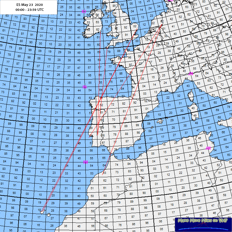 Rig: 12el/400w Log: 16:14 CT1ISH IM58 16:23 CT1EOD IM58 18:51 CN8LI IM63 "seen" 16;11 EA8CSB IL18 16;15 EA8CXN IL18 16;16 CT1FJW IM58 16;23 CT1FOQ IN50 16;24 CT1CAK IN50 Comment: First ES QSO's on 2m for 2020. Lucky to catch some stations, as I was on the edge of the ES-path. Opening to CT from 1610-1630utc (EA8 1612-1617utc) CN8LI was there from 1851-1858utc Not a single signal heard in SSB, although signals from CT where loud. A pitty, because in SSB a QSO is much faster, so more QSO's can be made during this kind of short openings. A lot of EA stations active and workd on 70MHz, |