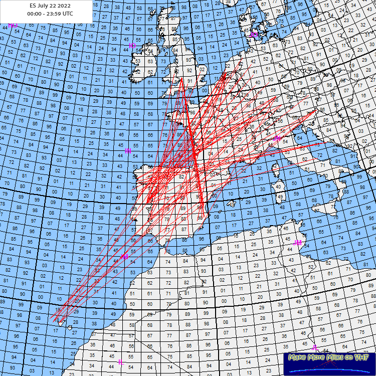 Rig: Home made Log: 09:51 EC5M IM98 FT8 10:56 EA9E IM75 FT8 11:46 EA7ACI IM77 FT8 11:55 EA4EIU IM68 FT8 12:05 EA4LU IM68TV, SSB 12:38 EA8JK IL18 FT8 12:41 EA8BPX, IL18 SSB 12:43 CT7AGE IN50SP SSB 12:44 CT1FPQ IN50QP SSB 12:57 CT2HRB IM68JT SSB Comment: Very interesting to see the Es cloud which developed initially over southern France, and subsequently very slowly moved to the west. The MUF of the cloud was nearly continuously over 144 MHz from 09 z till 13 z. In the early afternoon it had moved so far to the west that it finally coupled with the tropo duct between EA8 and the Iberian peninsula and enabled a long period of very strong signals from EA8. Only IL18 was heard, no activity from IL38 and 28? On FT8 EA8DBM peaked > 40 dB over the noise, but he seemed to work initials only. A nice surprise to work EA8BPX who was a solid 55 on phone! The past decades the Es season would often start in mid May and June was often good with few openings left in July. This year is more like I used to remember it from the eighties and nineties of last century: Poor Es in May, but good in June and July (on average). 73s and cu in next opening! Peter |