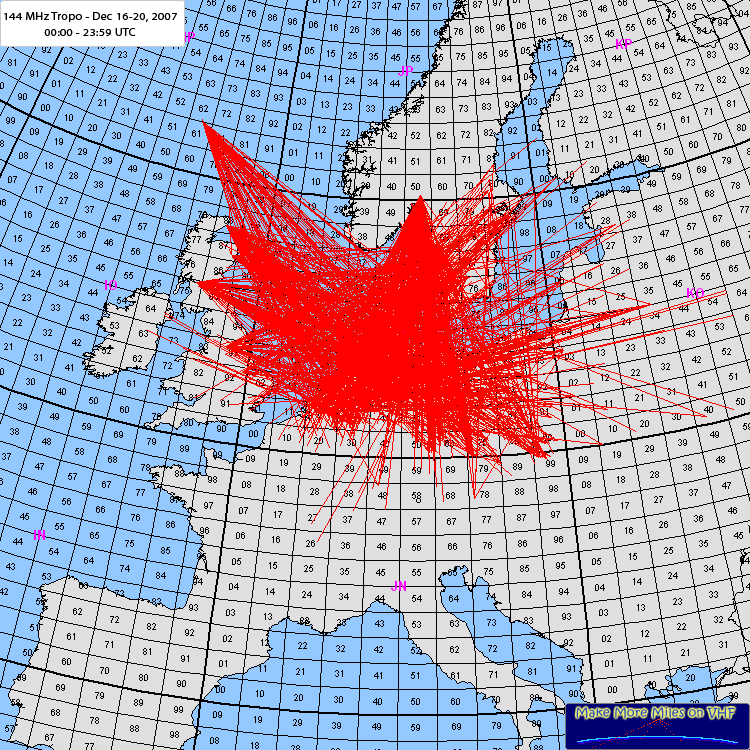 Fantastic tropo between Western Russia and United Kingdom!! On december 16th, tropo over the Baltic seas in combination with a high presuresystem over Central Europe provided possibilities for stations from Central Europe eg. OK, SP, central DL, to contact Juha, OH1ND. Juha was even reported by F6KIF/p in JN19 and in JO20 by PA4EME. Unfortunatly both did not succeeded to QSO. The conditions faded away but... When these tropoconditions in north-eastern direction faded away most did not expect them to return so fast and how!! The massive high presure area moved slowly from east to west. Temperatures on the ground were between 0 and a few degrees below. At hights between 100 and 250 meters the temperatures went well over 0 degrees and formed a nice inversionlayer. It was located over the flat parts of west, central and east Europe. It must have been fustrating for stations at higher ASL te be out of the conditions...the map tells everything. Distances to be worked were between 1100 - 1500 km from south to north and up to 2562 km east to west. Last distance was achieved with a QSO between UR5LX and GM0TGE. Other eastern stations worked were UT2XQ, UY5UG and RV3YM. It's a long time ago we could work so far to the east. Many stations added some (or many) km to their tropo ODX's. We have no problems with another opening like this! UPDATE: on december 30th the following logs were added: OE5VRL, MM5AJW, GW7SMV, GMoTGE, OK2AF, OK2PVF, SM7GVF, OK1AGE, OK1KZE, OK1ZHS, OK2BDQ, OK2BRD, DF1LON/P, SM7LCB, SP4MPB, OZ1FF and OY4TN. These logs were send to us by Matej, OK1TEH, and they are published on the OK2KKW webpage. |