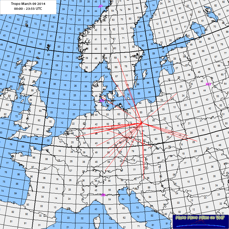 Rig: 2m: 500W-LNA-2x9el OWL @ 40m AGLODX: SM4GGC JO69RK 814kmLog: 07:26 DL8DAU SSB 559 559 JO40ME 602km07:40 ON5GS SSB 52 52 JO21SC 800km 07:51 HA1VQ SSB 59 59 JN87GJ 557km 08:24 DL6YBF SSB 55 55 JO31OX 666km 08:36 DL8YE SSB 55 53 JO32TC 636km 09:08 DK5SO SSB 55 53 JN58AV 624km 09:32 DB9NB SSB 57 54 JN59MB 557km 09:37 PA2CHR SSB 52 55 JO32DB 727km 09:44 DL1DBR SSB 54 51 JO41BN 612km 10:09 DN2VHF SSB 57 55 JO41GU 577km 10:48 DF1CF SSB 59 59 JN57FP 703km 10:54 DJ5NE SSB 51 51 JN59LW 500km 11:03 OE2UKL SSB 53-59 55 JN68LA 563km 12:45 SM6CEN SSB 59 57 JO67AJ 639km 12:57 SM4GGC CW 539 529 JO69RK 814km 13:02 US5WU SSB 57 56 KO20DI 557km 14:24 LY2FN SSB 41-51 55 KO14XV 540km 16:12 UR5BFX SSB 59 59 KN29TN 685km 16:12 EM200BT SSB 59 59 KN29TN 685km 16:20 UR5WCE SSB 53 55 KN29BT 578km 16:58 SM7GVF SSB 59 57 JO77GA 538km 17:07 OZ3Z SSB 56 53 JO45UM 588km 18:43 9A1CMS SSB 59 59 JN86DM 655km Comment: QSO above 500km 144MHzlot of QSO between 350-500km with small stations. Hepburn was wrong again :) much better conditions to North and East. Map shows direction to West with green and yellow... |