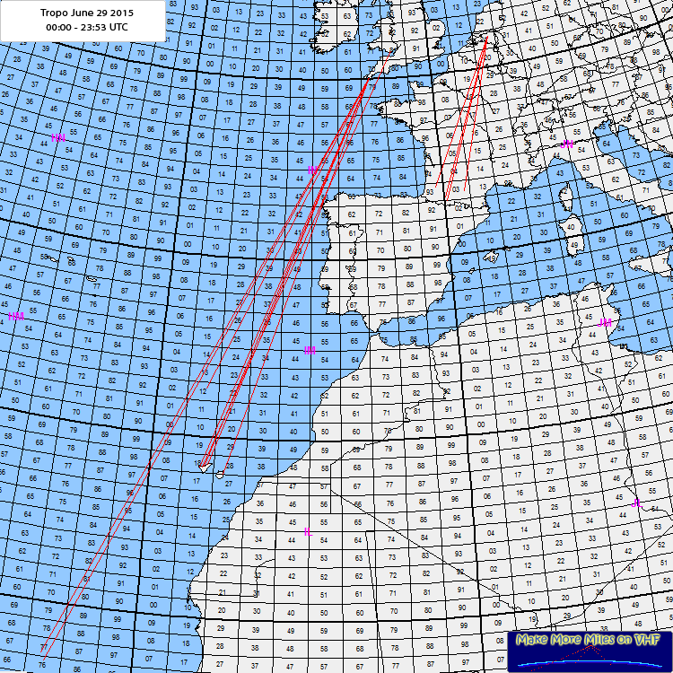 In the morning there was some tropo between southern France and Belgium/the Netherlands. At the same time there is seatropo between Cap Verde, the Canarian Islands and northen Spain towards Great Brittan providing long distance tropo. |