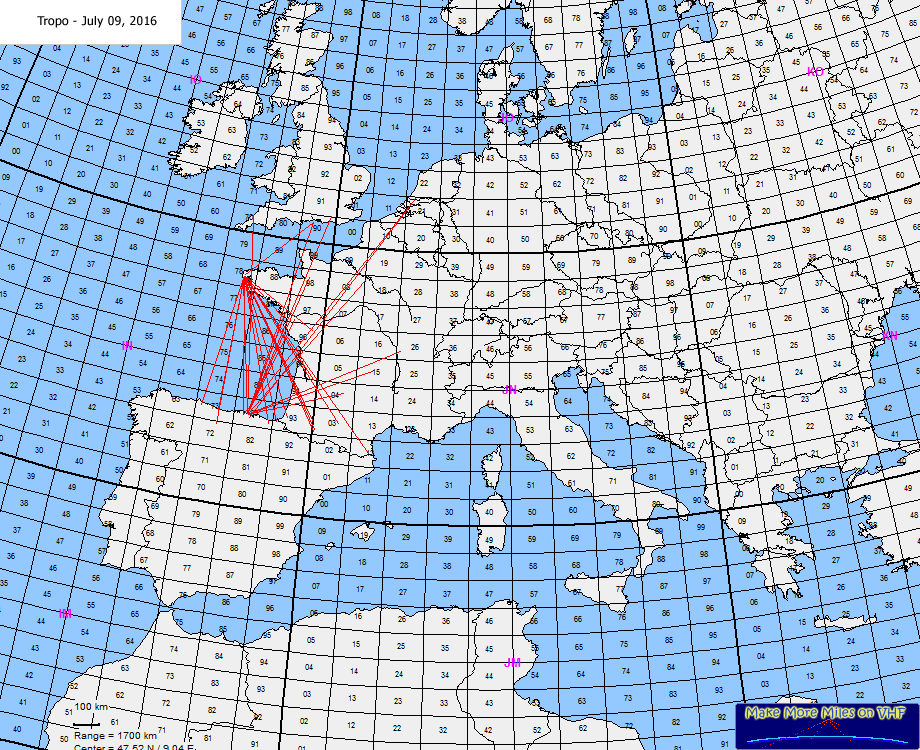 Rig: 50 MHz: 100w 5 el - 144MHz: 50w 9 el yagi - 432 MHZ: 30w 19 el yagiODX: F5ZAL/B (JN12LL) : 884 kmLog: Some of the most interesting QSO :05:04 F6DFI IN87WC 54 on halo antenna, 59+ on Yagi 05:10 F6DZR IN96RT 05:30 G7RAU IO90IR 59+++ 0603 F1IOZ/P JN15JN , also worked after on 432 MHz 06:52 F5FVP IN95WB 07:10 F5DUX IN93IN 07:39 F5SZR JN03AM 08:52 EA1DDU IN73EM on 432 MHz 09:06 EA2AWD IN93CI 09:52 F6FCW JN03BC 11:26 EA2TZ IN83WE also worked after on 432 MHz 11:39 F5ZAL/B JN12LL 11:47 EA2CSC IN72OW 11:52 F5ICN JN03BF 12:13 F4ARU JN03QL 14:02 EB1AST IN73OK 14:29 EA1UU IN83GJ Comment: Good tropo all the day on 144 and 432 MHz between UK to south west of France and Spain. In addition, E Sporadic opening to the Canary Islands around 12h30 Z |