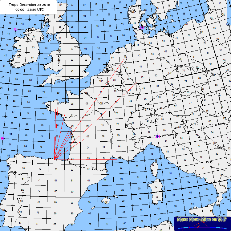 Rig: IC-7100 50w ant:DK7ZBdual antena yagi 5ele. 2mts/8el.432ODX: DF6PW; JO40Log: 16:29 FT8 PE1BIW JO3216:37 FT8 F1DRN JN23 17:57 SSB F6DBI IN88IJ 18:12 F6DFI IN87WC 19:00 FT8 DF6PW JO40 20:41 FT8 F4IAA JN05 21:09 SSB F4HEX IN96LN 21:12 F6IPL IN95KX 21:40 SSB F4DEY/P IN88MJ 21:51 SSB F5SRH IN97AQ Comment: staring tropo to Ne dir. in Christmas days, |