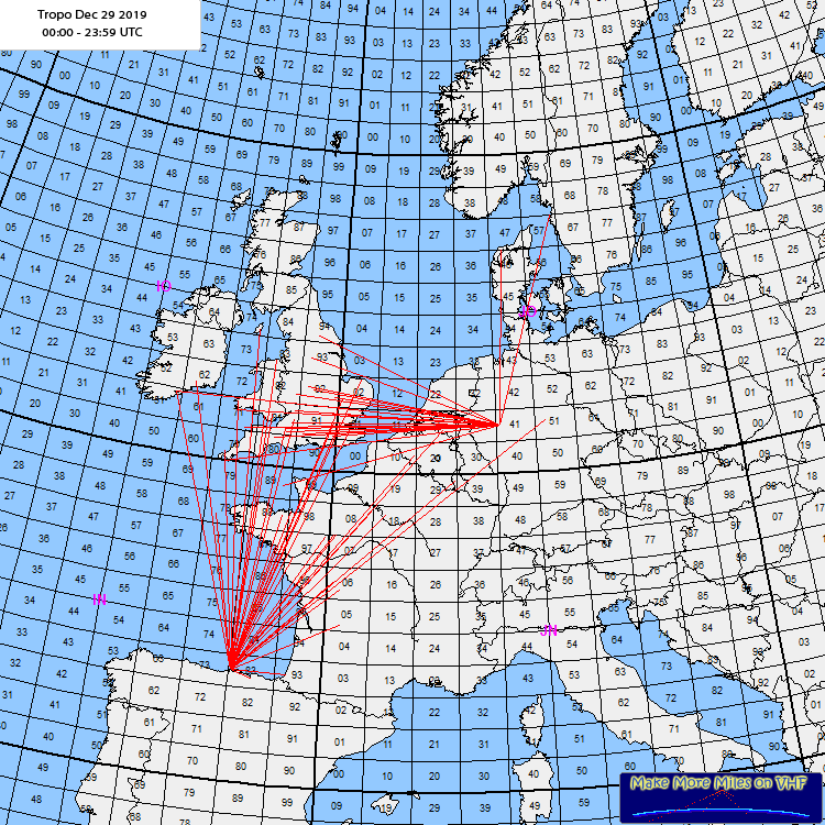 Rig: IC-706MKII 20w, 4 element yagi.ODX: DK5AI 1406 kms.Log: 11:55 LX1ER JN29XU11:58 F5HDK IN97FF 12:01 G8TTI IO81WM 12:04 F4DNS JN08EB 12:08 F5MUX IN78 12:10 M7BAZ JO02NW 12:14 F4HER JN06 12:16 M0BDQ JO01BN 12:39 G0LTG IO81RF 12:58 M0AFJ IO70 13:03 ON4KHG JO10XO 13:10 F4BDG JN18HR 13:12 PE1ITR JO21QK 13:15 DK5AI JO51GO 13:25 F1MPQ JN08XS 13:34 F5BQV IN87SN 13:43 F1GTU JN05IE 13:50 GW4HDF IO81JO 13:55 GW8ASA IO81EM 13:59 G4BAO JO02CG 14:15 F1ETW JN06EM 15:34 F5CBU IN88VM 15:43 F5NMO IN97WW 15:45 EI8KN IO62 15:51 F6IFX JN07CX 15:56 GD3YEO IO74SE 16:00 F5SEA IN98BP 16:07 G4FVZ IO91WM 17:52 F6BNT IN95 18:06 F4IAR IN93GL 18:14 M0IPU JO01 18:18 EI3KD IO51VW 20:07 GW0KZG IO71LW 20:24 EI8KN IO62 20:25 EA1UU IN83MG 20:28 G0MJW IO83 Comment: Great tropo like yesterday. No OZ stations heard today, but a lot of central europe stations, from LX to EI. Heard some stations in phone and cw mode, but I could only work G0LTG in ssb. HNY. |