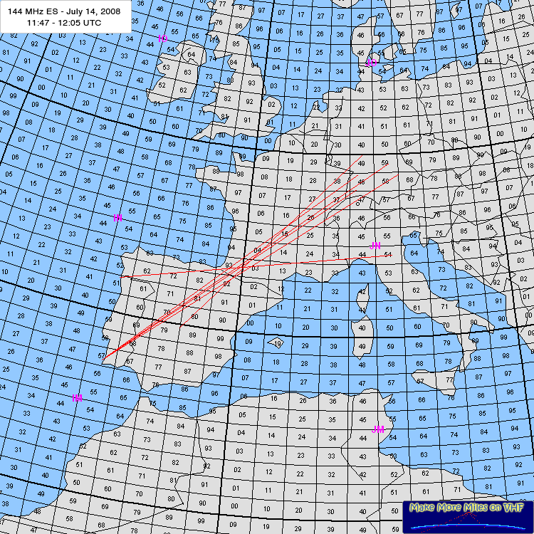Again in the southwest. High MUF's in the morning above the Balkan when BC from TA was strong into DL for almost 1 hour while at the same time another two SCP's were approaching from CT/EA to DL and CT/EA to G/EI. The one for DL reached 144 at app. 11.40 UT when CT1HZE was 59 into JN47. A very spotty opening started with short peaks above 144 MHz.