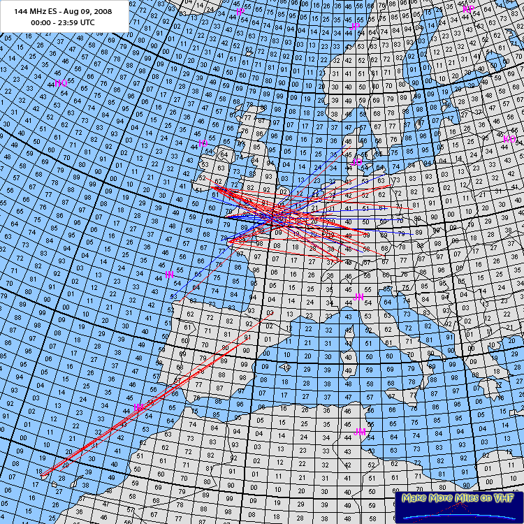 Extremely high MUF over JO00/JO10. Sporadic E occured between EI/G to DL/F. Also EA to OZ was reported. Blue lines are spots taken from CLX. Red lines are spots send to MMMonVHF and the reports are below.