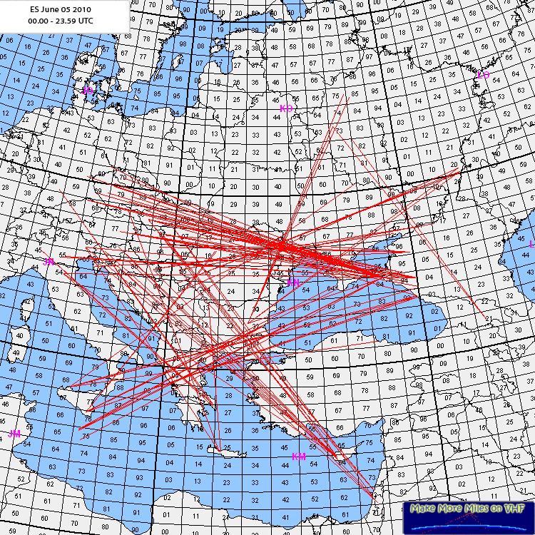 Rig: IC-910H 100 W 2,5 x wl Flexa Yagi ODX: SV1OAA KM17VV 1699km Log: 08:06 SV1OAA KM17VV 59 59 1699km Comment: I was surprised that the opening came in so early. I wkd some minutes before E4X on 6m (finally), but only few stations were qrv and could be heard, signals on 6m weren't so strong. Also the activity on 2m was low, so I catched SV1OAA with a single call. It remained the only station for this day, during the morning the ES-cloud moved south....For me it was the 2nd opening here in JN49. |
