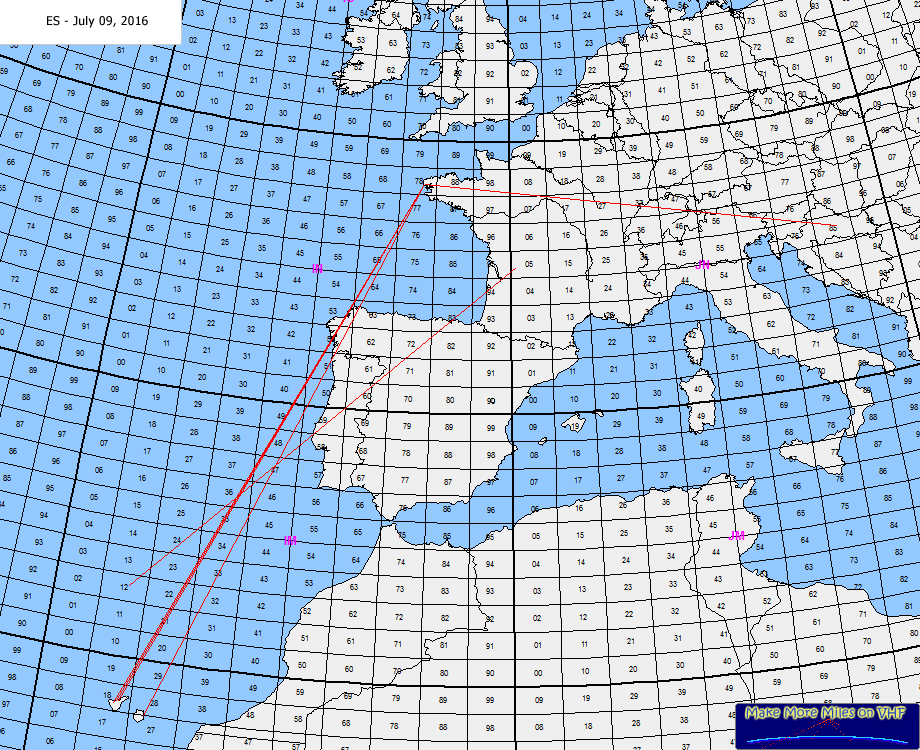 Rig: 50 MHz: 100w 5 el - 144MHz: 50w 9 el yagi - 432 MHZ: 30w 19 el yagi ODX: EA8TX Log: 12:27 EA8BPX IL18SK (2439 km) 51/52 (144.325) 12:37 EB8BRZ IL28HA (2446 km) only HRD 52 (144.310) 12:42 EA8TX IL18QI (2454 km) 56/51 (144.350) 12:45 EA8TJ IL18RJ (2445 km) only HRD 52 (144.350) Comment: First usable ES for me this year. Good tropo from UK to south west of France and Spain since early this morning and suddenly I heard and work Canary island of Tenerife during about half an hour. Signals with QSB between zero and 56. Many thanks gentlemen for spreading around 144.300 ! 73 to all. |