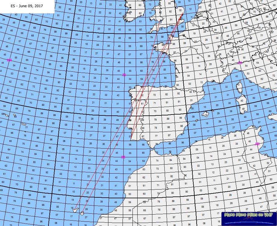 Rig: K3 Transverter 8877PA 4XI0JXX16 ODX: EA8TX IL18qi 3050Km Log: 09:40 EA8TX IL18qi 3050Km 09:45 EA8AVI IL28fc 3032Km 09:49 CT1HZE IM57nh 1846Km 09:51 EA8TX IL18qi 3050Km 10:15 EA8TX IL18qi 3050Km Comment: This e-s + tropo opening to EA8 was almost predictable. Hepbururn tropo precictions were backed up by reports from EA8TX of strong tropo to CT1. When the FM band openned to CT1 all there was left was to call CQ. A pity that there were only 2 ststions QRV in EA8, I have shown all QSOs with EA8TX to show how long it lasted. |
