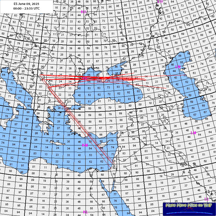 Rig: IC-706, 2x9el Tonna, 80is watts ODX: 4X5CD KM72 1703km Log: 12:20 RZ6DD LN04 FT8 1494km 12:57 R7BN LN05 FT8 1493km 12:58 RT6C KN95 FT8 1337km 13:00 RV6FX LN04 FT8 1494km 13:03 RK6BAG KN95 FT8 854km 13:07 R6AM LN04 FT8 1494km 13:35 YT0K KN13 FT8 53km 14:10 4X5CD KM72 FT8 1703km 14:13 4Z5LA KM72 FT8 1693km 14:18 4Z5MU KM72 FT8 1652km 14:27 4Z5CX KM71 FT8 1741km 14:41 YO3CCB KN34 FT8 388km Comment: Surprising, first time getting to 4X and first time going over Black Sea to Russia on VHF, so pretty exciting for me. |