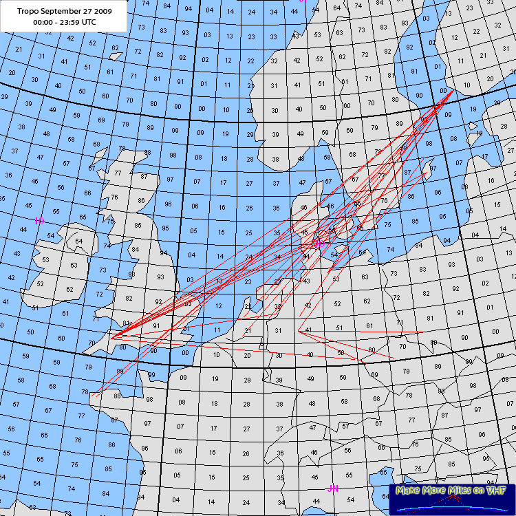 A very nice autumn tropo. The best path of propagation was over sea and the best reported DX sofar is between western France and Finland. The distance from KP00 to IN78 exeeds 2100 km which is exceptional for northern Europe! |