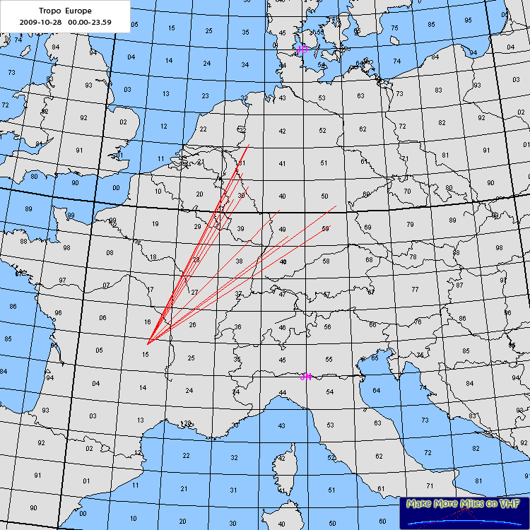 Rig: FT847 - 16 ele yagi -100wLog: 18:00 DF0HF JO50SF 55 56 (802km)18:10 DL3IAS JN49OI 52 57 (609km) only 5w 20:05 DF5NK JN59OP 59 59 (746km) 21:08 DD9EN JO31JG 55 57 (668km) 20:11 DF0MU JO32PC 56 59 (767km) 20:15 DL1EJG JO31MF 52 57 (676km) 20:18 DL6YBF JO31OX 53 55 (752km) 20:25 DL8DAK JO30PU 53 51 (644km) 20:45 DL3FBJ JO40JD 58 58 (646km) 21:23 DM4KCS JO30HK 56 59 (581km) Comment: Nice opening but not very long distance QSO ....Beacon heard during these 4 days (27,28,29,30 October) from JN15MT ( 10km ouest from Clermont -Ferrand): - FX3THF with my antenna azimuth 45° !! - F5ZXK in JN18KF with strong signal even with the "ultralow" signal - F5ZXV in JN38CO ( Nancy)for the first time - DB0MMO in JN49RV both on 144 and 432Mc - DBOIH in JN39Ml on 70cm |