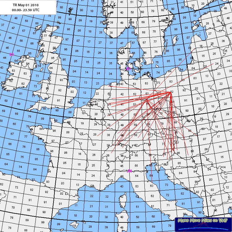 Rig: 2m: IC-275A - 9el G0KSC OWL Yagi @12m AGL + 135m ASLODX: HB9GT 803kmLog: During contest nice tropo, qso made with 25W and 12dBd :)Worked (above 600km): UTC CALL LOC QRB 15:12 S50C JN76JG 707km 15:17 DK1KC/P JN58QH 606km 15:25 DK0ES JN48TN 673km 15:45 HG1Z JN86KU 626km 15:46 S59P JN86AO 657km 16:16 DR9A JN48EQ 733km 16:18 DL0GL JO31KP 690km 16:57 HG10P JN96EE 708km 17:56 DJ2QV JN57XX 611km 20:03 S53A JN86FN 659km 20:27 DF0OL JO40BP 638km 20:40 HB9GT JN47MH 803km 20:46 DF0MU JO32PC 653km 20:59 DR1D JO30IK 740km 22:05 S57O JN86DT 632km 22:23 DL0KB JN47KW 761km 03:50 DL0LB JN49QA 653km 04:33 S57Q JN76PB 723km 05:47 DL6IAK JN48IX 694km 08:43 PI4GN JO33II 688km 09:10 S53O JN86AT 633km 12:25 DL4MHA JN58QI 602km 13:14 DK5DQ JO31PG 671km 13:46 DK0PU JO31JN 697km 13:48 DL1BDR JO41BN 607km Comment: I also heard stations with great qrb on single 12dBd antenna without LNA !: I5PVA/6 JN63GN 1042km, G0KPW JO02RF 1049km, HB9RF JN47GC 846km, 9A0V JN95MI 808km, IQ3AZ JN65QQ 797km, PA5MS JO21RQ 787km, TM57M JN39OC 780km, 9A6K JN95KU 751km and many more with qrb between 500-700km lot of records here http://sp3iym.com/files/records/2nd2010/ more info here http://sp3iym.com/2nd_test2010.html |