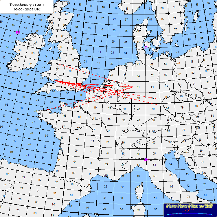Tropoconditions are building up as we speak. QSO's with distances of 1000 km are in reach. Better conditions are expected for tomorrow which will more intresting as we will have activity contests on the first thuesday evening of February. Please report your tropo on 144 MHz to MMMonVHF. |