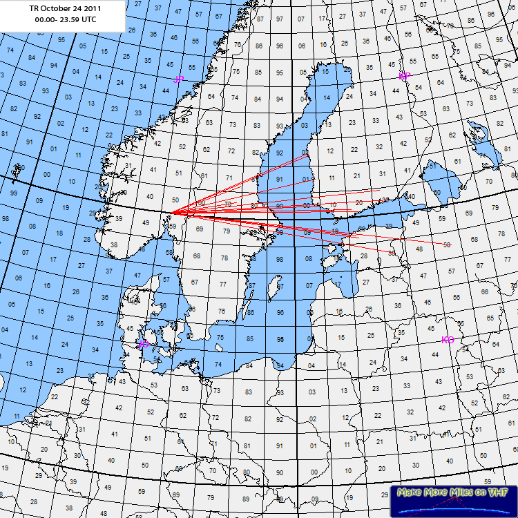 Rig: 144: 180W 9el - 432: 120W 17el PreampODX: RA1TBH KO58PN 1175kmLog: Worked on 144 MHz: 20:39 OH1UM KP01UL 559 599 620 km 20:45 OH1ND KP00XL 579 569 623 km 20:50 RA1TBH KO58PN 55 55 1175 km 21:08 SM4MKF JP70TO 529 559 280 km 21:15 OH2BZP KP20JF 519 539 780 km 21:20 ES5QA KO38OM 539 559 949 km 21:21 OH2LE KP20DH 559 559 751 km 21:22 OH5LK KP30ON 579 599 910 km 21:24 OH5IY KP30HV 54 57 877 km Worked on 432 MHz: 19:29 SM3JGG JP71XF 579 599 318 km 19:37 OH5LK KP30ON 599 599 910 km 19:40 OH6KTL KP02OJ 519 539 623 km 19:42 OH6PA KP02PL 539 539 630 km 20:05 ES2DF KO29GG 599 599 780 km 20:24 ES3RF KO29IF 579 579 791 km 21:32 OH5IY KP30HV 559 579 877 km Comment: Nice Tropo opening to the East, but not much activity on a Monday evening. |