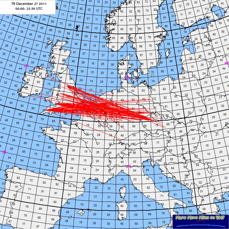 Rig: 144 Mhz: Kenwood TS711e - SSPA 350w out - LNA - 9el LYODX: OK1NI 1290KmLog: 09:43 DG1KBY JO30VW 770Km SSB09:46 ON6VOX JO10NT 450Km SSB 10:16 PD0HCV JO31FW 669Km SSB 10;51 DL6YBF JO31OX 721Km SSB 11:00 DL9EAJ JO31DH 661Km SSB 12:18 DG9YIH JO32PC 726Km SSB 12:20 DD3SP JO72EN 1202Km SSB 13:32 DK8VK JO50UR 1046Km SSB 13:35 DL8DAU JO40ME 874Km SSB 14:06 OK1FD JO60CF 1093Km SSB 15:19 DG0OPK JO50GQ 966Km SSB 16:11 DC1EI JO31FC 675Km SSB 16:36 DL6NAA JO50VF 1064Km SSB 16:49 OK1TEH JO70FD 1251Km SSB 16:48 DL1VPL JO61UA 1179Km SSB - New # 17:05 DK9TF JO31NF 720Km SSB 17:11 DG8ZN JO40MN?? 865Km SSB 17:16 OK1NI JO70OQ 1290Km SSB 17:21 DM4KL JO61VE 1182Km SSB 17:25 DD0PX JO30WR 780Km SSB 17:42 OK1TEH J070FD 1251Km SSB 18:16 DK3EE JO41GU 813Km SSB 18:27 DH3NAN JO50NC 1031Km SSB 18:29 DF7VX JO41KP 837Km SSB Heard SP6IWQ JO80HK 1392km 519 CW but no CW here yet Comment: Good tropo but operating time limited by family commitments. Wished I had learnt CW (started recently but not competent yet)- if I had, I could have made a qso with SP6IWQ. Good end to 2011. I hope for more in the new year73 Lyn GW8JLY |