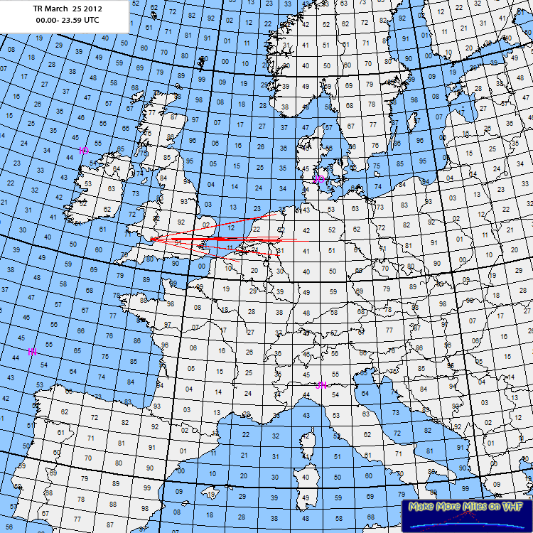Rig: FT897, 250W PA, 18dB Preamp, 13el yagi 50m asl 9m aglODX: G0BLB IO81RI 767kmLog: 07:27 G3LTF IO91GG07:12 OK1TEH JO70FD 08:38 2E0NEY IO81VK 08:35 G0BBB IO91PK 08:44 G0BLB IO81RI 08:45 G4JZF IO82XO 09:01 G2BOF IO91VI 09:08 G3UDA IO82OQ 09:11 G0NNF IO92AL 09:36 OK1FPR JO80CE 09:48 SP2MKO JO93CB 11:01 G4AEP IO91NJ 13:34 OK1ZHS/P JO70EC 14:52 F1MPQ JN08XS 15:04 F6DKW JN18CS Comment: It was one of our best vhf results in history of Hamradio Helgoland Meeting. The Meeting takes place every two years at end of march.Tropo opening began on saturday evening with a nice duct from southwest to northeast. Stations from G and OZ/SM worked. On sunday morning we became contest feeling: many stations from western and central europe were logged. The conditions on 70cm were also very nice at the same time, ODX G0JLO, IO81WM, 733km. 73 Chris DK2CRN |