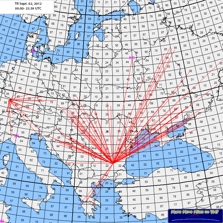 Rig: FT-817NDODX: 622 9A1P JN38SV <-> JN65VGLog: 02/09/2012 06:52 DR2X 144MHz PH 59 031 59 615 JO40QL 220 km02/09/2012 07:46 DK0BC 144MHz PH 59 032 59 166 JN48RN 146 km 02/09/2012 08:34 OK1PGS 144MHz PH 59 033 55 388 JN69JW 398 km 02/09/2012 08:41 OK1WT 144MHz PH 59 034 59 399 JO60RA 446 km 02/09/2012 08:52 HB9CQL 144MHz PH 59 035 59 083 JN37TL 158 km 02/09/2012 08:57 IK3UNA/P1 144MHz PH 59 036 59 450 JN44OQ 485 km 02/09/2012 09:15 F4KIU 144MHz PH 59 037 59 006 JN38XV 31 km 02/09/2012 09:17 DJ2QV 144MHz PH 59 038 59 443 JN57MP 294 km 02/09/2012 09:39 DH2PA 144MHz PH 59 039 59 053 JN49AE 49 km 02/09/2012 09:54 OK1KCR 144MHz PH 59 040 59 644 JN79VS 606 km 02/09/2012 10:01 HB9AW 144MHz PH 59 041 59 071 JN37XC 202 km 02/09/2012 10:38 HB9AG 144MHz PH 59 042 59 168 JN47IH 196 km 02/09/2012 11:31 OE5D 144MHz PH 59 043 55 513 JN68PC 433 km 02/09/2012 12:01 F6DCD 144MHz PH 59 044 59 064 JN38RQ 24 km 02/09/2012 12:19 DL0HCG 144MHz PH 59 045 59 114 JN48KO 103 km 02/09/2012 12:53 OK2M 144MHz PH 59 046 59 822 JN69UN 454 km 02/09/2012 12:59 S59DEM 144MHz PH 59 047 59 662 JN75DS 617 km 02/09/2012 13:08 DH3NAN 144MHz PH 59 048 59 139 JO50NC 292 km 02/09/2012 13:24 9A1P 144MHz PH 59 049 59 507 JN65VG 622 km 02/09/2012 13:59 DK1KC/P 144MHz PH 59 050 55 407 JN58QH 290 km Comment: Better propag this 2nd day of IARU VHF Contest.Not so bad for my 5w HI 73 From F0GRC |