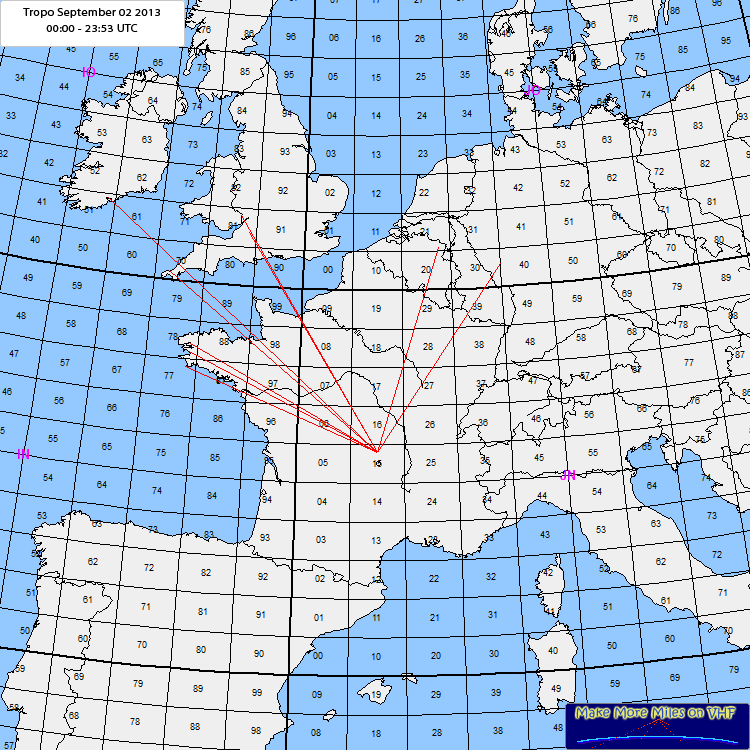 Rig: TS700G - 60W - 9ele F9FTODX: EI3KD (1069km)Log: 07:12 2E0NEY IO81VK (736km)07:40 F1EQS/P/29 IN78VF (613km) 07:41 F4EJW/29 IN78VJ (621km) 07:55 F4GWG/29 IN77TT (608km) 08:10 G8AOJ IO81QS (783km) 08:28 DF1PU JO40AO (650km) 08:29 ON5GS JO21SC (618km) 08:42 EI3KD IO51VW (1069km) 09:08 M0GRE/P IO70HE (794km) hrd : 09:25 GW8ILY Comment: Nice tropo opening during 2 hours NW direction. F5ZRB IN87KW hrd 57 from 07:30 to 09:00 |