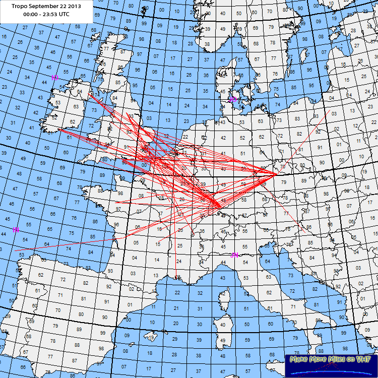 Rig: FT-857 - 130W - 10el . YagiODX: EI3KDLog: 16:45 G4CZP IO90JO 775km18:00 M0BKL IO80FK 930km 18:14 G7RAU IO90IR 785km 19:00 G8GXP IO93FQ 926km 19:10 GW8ASD IO83LB 999km 19:12 GI4SNA IO64XM 1250km 19:38 M0FCD JO00DW 689km 19:45 G0PQF JO01BU 746km 20:11 G4CDN JO02SS 729km 20:13 F5EAN JN06CE 683km 20:20 F4GPJ JN08ST 540km 20:27 G3YDY JO01FQ 717km 20:34 G0BBB IO91PK 776km 21:07 M0MCV JO01AL 731km 21:10 G8PPQ JO01NI 658km 21:17 F6CTT IN97HV 756km 21:37 M5BFL IO91NP 796km 21:41 G4AJC IO91VJ 742km 21:56 GD8EXI IO74PC 1152km 21:59 GI6ATZ IO74AL 1243km 22:45 EI3KD IO51VW 1284km Comment: Nice opening, sometimes deep QSB. GB3NGI/B IO65VB has been strong at midnight. Only contact above 500km in the list - thanks to all, 73. |